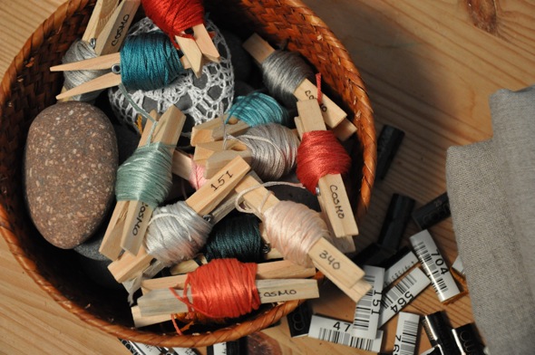 I spent Tuesday evening winding embroidery floss onto clothespins. The floss is from The Workroom's new online shop - their "City Rain" palette. The clothespins idea came from Pinterest - here and here. I thought it was a cute way to control all those skeins of floss. I wrote the colour numbers onto the arms of the pins so when I start to run out of something I can order more of the same colour.