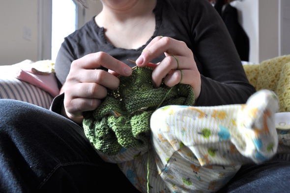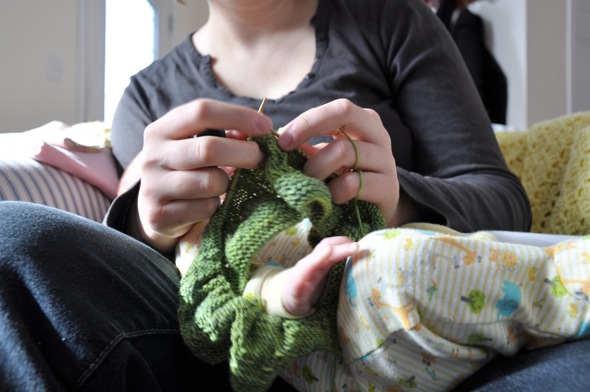I spent yesterday perfecting a new skill. Provided she's deeply asleep, I can now knit with Maisie in just about any position that doesn't require both of my arms to hold her up. The result is that last night I joined the sleeves to the body of her new sweater. I'm now firmly in yolk territory and everything decreases from here.