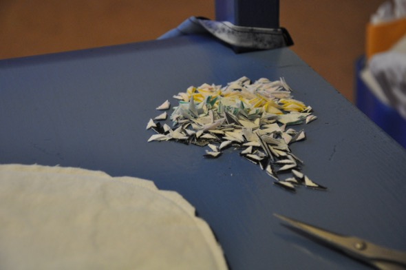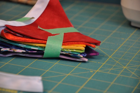 My sewing room is an especially colourful place right now. I’m getting ready to participate in one of the fall craft fairs. I had a table last year and found it a really fun and interesting experience. I liked seeing what everyone else had and talking to the people who stopped at my booth. I was right inside the door so I got to see almost everybody who came in. It was also a lot of hard work to prepare for and this year I got started a little earlier and very gratefully accepted my Mum’s offer to help out with some of the more mundane tasks like cutting shapes and trimming corners. I’m selling things for babies and mums: bibs, rattles, (my favourite) nursing pads and buntings. Most things are along a rainbow theme. I just think rainbows and babies go so well together. Rainbows are so bright and cheerful and still pretty gender neutral. I’ve a little list of additional things I might add if I have enough time but I’m not gong to stress myself out over them.