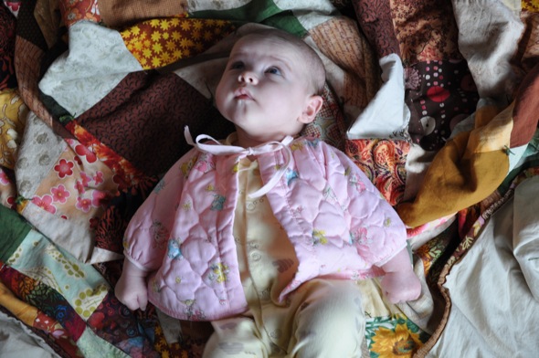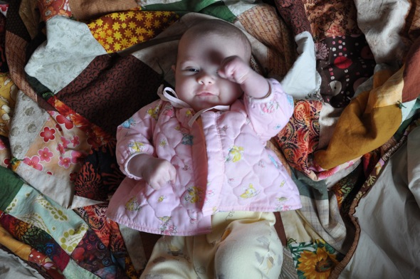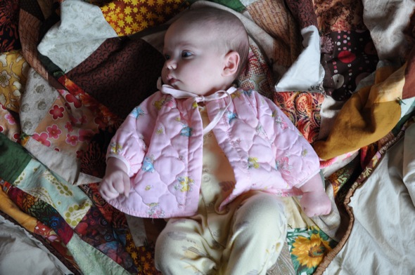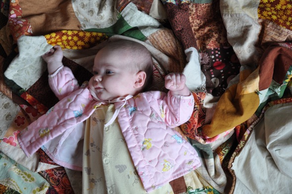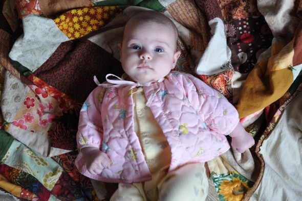 When my mum lent me the little pink dress Maisie wore for her welcome party she also lent me this little jacket (there is a pair of pants and a bonnet that go with it). She had made them for me when I was tiny and they were obviously well loved. The fabric is quilted and covered in sweet little bunnies. It was too big for Maisie when Mum dropped it off and I wish I'd remembered about it earlier so I could have put the whole outfit on Maisie and gotten more use out of the jacket. I'm glad I remembered in time for her to wear it once before it got too small. It's just as sweet as she is.