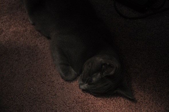 I realized part way through this week that we are now more than halfway through the month and I am much less than half way through my fiddlehead mittens. I went to knitting on Monday night and discovered I hadn't worked on my mittens once since last week. I worked all the way through the purple section while I was there and took advantage of some sleeping kittens time to get in the first few rounds of red this evening.