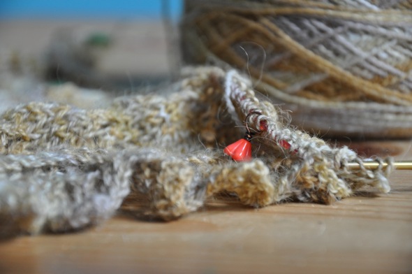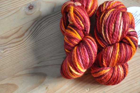 two skeins of Sheep Shop Sheep 2 Yarn in bright fiery warm reds and oranges. I've wound this up and cast-on for a bulky cowl but I'm not sure I have enough yardage. I'm a little undecided on what I'll do if the cowl doesn't work out. I saw some versions of the Yarn Harlot's Unoriginal Hat in this yarn that looked pretty cool (er … warm) but I don't know what I'd do with the second skein.