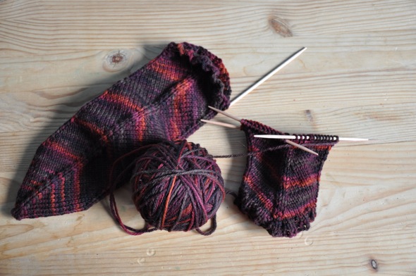 a pair of mittens I started in the spring. It's not going to be too much longer before I'll be wanting to wear these. It would be handy if they were finished and had thumbs by then. I'm following the Mitred Mittens pattern from Elizabeth Zimmerman's Knitter's Almanac.