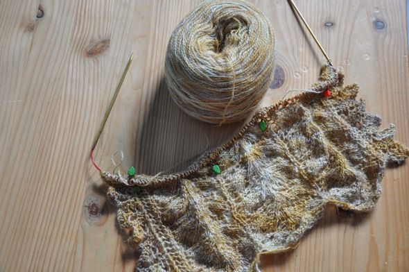the Gnarled Oakwoods Stole I started in BC three years ago. Somehow in the intervening time I had developed an idea that this yarn was not working out for this pattern. I don't know what I was thinking. I did a few rows and remembered how lovely this yarn and these needles felt to work with. Maybe this year will be the year I sit down and work on something a little more difficult. Maybe I'll wear a new stole to Rob's staff Christmas party in December.