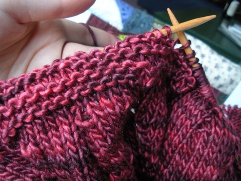 Doesn't that look warm and cozy? For added coziness add the smell of slowly cooking turkey stock that was starting to fill our house. Oh ... so lovely. The greatest part about getting to the short rows was that after the first two there is no counting - I just watch for the gap.