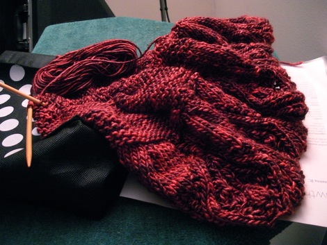 I kept going with the short rows until I was getting a little too hungry to stay put and plan to get back to them as soon as this is posted. I'm hoping to get to the end of my second ball of yarn tonight. I thought I was going to have to wind the third one before now but it looks like I've got a few rows left and I'm anxious to see how many.
