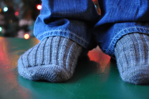 I only had two projects this year but since both of them were for Rob I had to get creative about when and where I was knitting. Project number one was a new pair of socks. Just a simple 2x2 rib around 64 stitches. The yarn is Socks that Rock Lightweight in "Manly yes, but I like it too". I had already used up a tiny bit of this skein to finish a pair of socks for Rob and I was knitting nervously - trying to make the socks as long as possible in the leg without running out of yarn. I was working toe-up so I had a bit of a safety net but I didn't stop me from worrying. I didn't get started quite early enough in November either and was racing to finish in time. The first sock took about a month; the second was done in four days! I finished work a day and half before Rob did and knit like a mad thing the whole time he was out of the house. The result was an awesome pair of socks in his stocking and I think it was totally worth it.