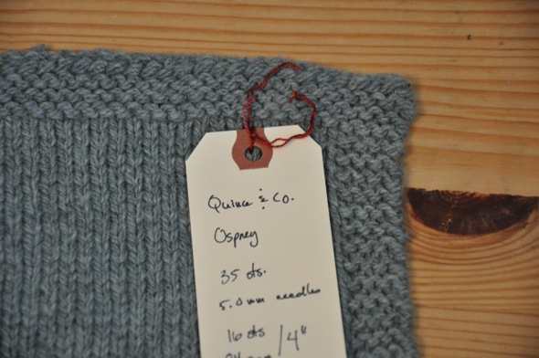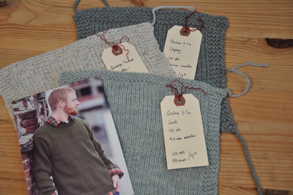 Project number two was kind of a proto-project. I've been wanting to make another sweater for Rob lately and Christmas seemed like the perfect reason to get started. I ordered samples of three different yarns, knit six swatches - each yarn at two different tensions - and wrapped up the best three along with a picture of the pattern I was thinking of and colour cards to go with the yarns. Rob got to choose the fabric he liked the best, a colour he'd be happy to wear and confirmed that the pattern I'd suggested was the right style.